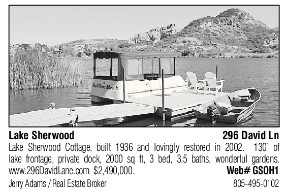 Lake Sherwood 296 David Ln Lake Sherwood Cottage, built 1936 and lovingly restored in 2002. 130’ of lake frontage, private dock, 2000 sq ft, 3 bed, 3.5 baths, wonderful gardens. www.296DavidLane.com $2,490,000. Web# GSOH1 Jerry Adams / Real Estate Broker 805-495-0102