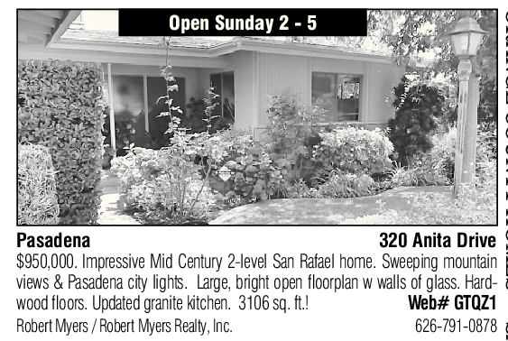 Pasadena 320 Anita Drive $950,000. Impressive Mid Century 2-level San Rafael home. Sweeping mountain views & Pasadena city lights. Large, bright open floorplan w walls of glass. Hardwood floors. Updated granite kitchen. 3106 sq. ft.! Web# GTQZ1 Robert Myers / Robert Myers Realty, Inc. 626-791-0878