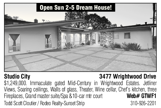 Studio City 3477 Wrightwood Drive $1,249,000. Immaculate gated Mid-Century in Wrightwood Estates. Jetliner Views, Soaring ceilings, Walls of glass, Theater, Wine cellar, Chef’s kitchen, three Fireplaces, Grand master suite/Spa &10-car mtr court Web# GTWF1 Todd Scott Cloutier / Rodeo Realty-Sunset Strip 310-926-2201