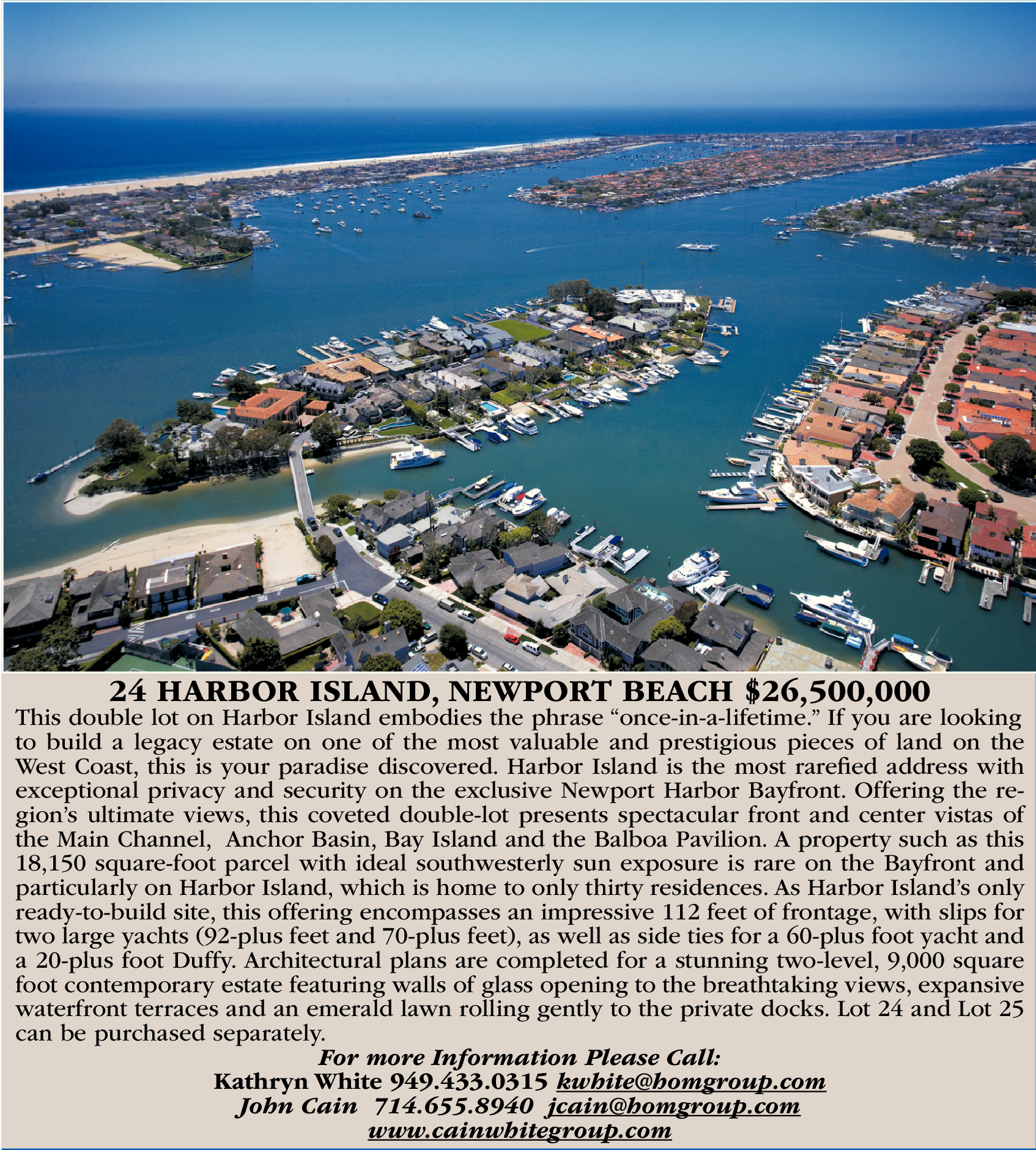 24 HARBOR ISLAND, NEWPORT BEACH $26,500,000 This double lot on Harbor Island embodies the phrase “once-in-a-lifetime.” If you are looking to build a legacy estate on one of the most valuable and prestigious pieces of land on the West Coast, this is your paradise discovered. Harbor Island is the most rarefied address with exceptional privacy and security on the exclusive Newport Harbor Bayfront. Offering the region’s ultimate views, this coveted double-lot presents spectacular front and center vistas of the Main Channel, Anchor Basin, Bay Island and the Balboa Pavilion. A property such as this 18,150 square-foot parcel with ideal southwesterly sun exposure is rare on the Bayfront and particularly on Harbor Island, which is home to only thirty residences. As Harbor Island’s only ready-to-build site, this offering encompasses an impressive 112 feet of frontage, with slips for two large yachts (92-plus feet and 70-plus feet), as well as side ties for a 60-plus foot yacht and a 20-plus foot Duffy. Architectural plans are completed for a stunning two-level, 9,000 square foot contemporary estate featuring walls of glass opening to the breathtaking views, expansive waterfront terraces and an emerald lawn rolling gently to the private docks. Lot 24 and Lot 25 can be purchased separately or more Information Please Call: Kathryn White 949.433.0315 kwhite@homgroup.com John Cain 714.655.8940 jcain@homgroup.com www.cainwhitegroup.com