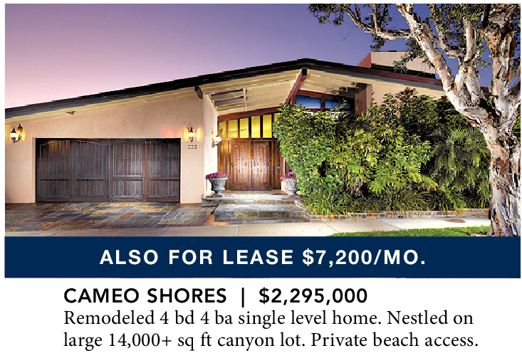 CAMEO SHORES | $2,295,000 Remodeled 4 bd 4 ba single level home. Nestled on large 14,000+ sq ft canyon lot. Private beach access.