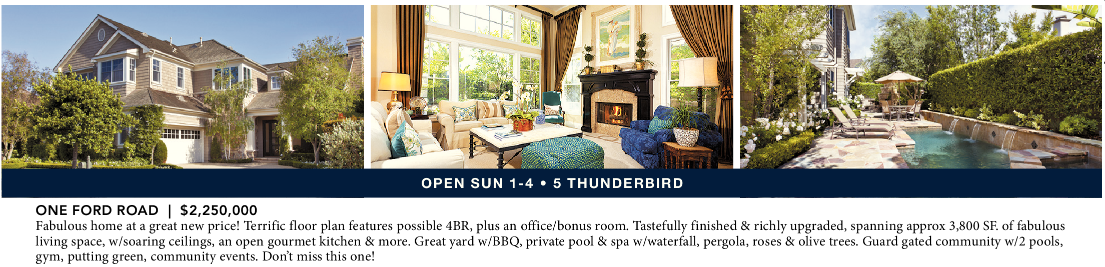 ONE FORD ROAD | $2,250,000 Fabulous home at a great new price! Terrific floor plan features possible 4BR, plus an office/bonus room. Tastefully finished & richly upgraded, spanning approx 3,800 SF. of fabulous living space, w/soaring ceilings, an open gourmet kitchen & more. Great yard w/BBQ, private pool & spa w/waterfall, pergola, roses & olive trees. Guard gated community w/2 pools, gym, putting green, community events. Don’t miss this one!