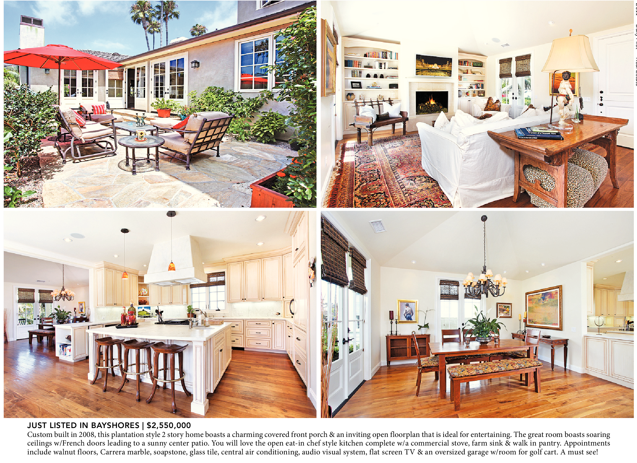 JUST LISTED IN BAYSHORES | $2,550,000 Custom built in 2008, this plantation style 2 story home boasts a charming covered front porch & an inviting open floorplan that is ideal for entertaining. The great room boasts soaring ceilings w/French doors leading to a sunny center patio. You will love the open eat-in chef style kitchen complete w/a commercial stove, farm sink & walk in pantry. Appointments include walnut floors, Carrera marble, soapstone, glass tile, central air conditioning, audio visual system, flat screen TV & an oversized garage w/room for golf cart. A must see!
