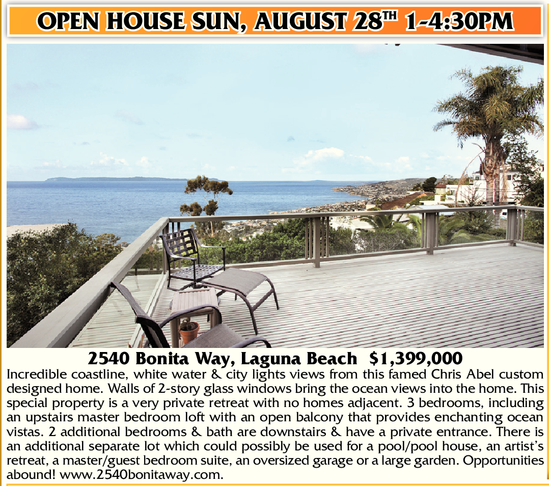 OPEN HOUSE SUN, AUGUST 28 TH 1-4:30PM 2540 Bonita Way, Laguna Beach $1,399,000 Incredible coastline, white water & city lights views from this famed Chris Abel custom designed home. Walls of 2-story glass windows bring the ocean views into the home. This special property is a very private retreat with no homes adjacent. 3 bedrooms, including an upstairs master bedroom loft with an open balcony that provides enchanting ocean vistas. 2 additional bedrooms & bath are downstairs & have a private entrance. There is an additional separate lot which could possibly be used for a pool/pool house, an artist’s retreat, a master/guest bedroom suite, an oversized garage or a large garden. Opportunities abound! www.2540bonitaway.com.