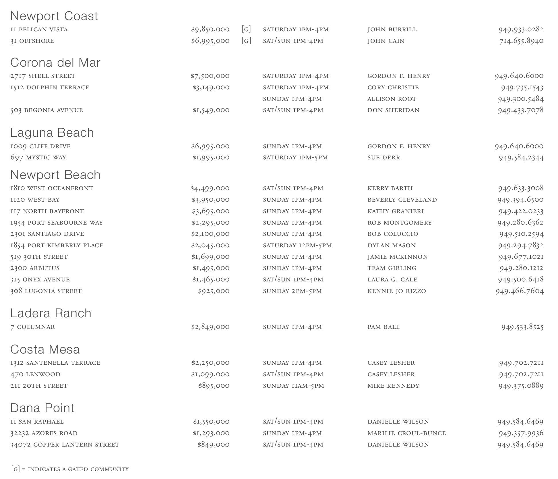 11 pelican vista $9,850,000 [g] saturday 1pm-4pm john burrill 949.933.0282 31 offshore $6,995,000 [g] sat/sun 1pm-4pm john cain 714.655.8940