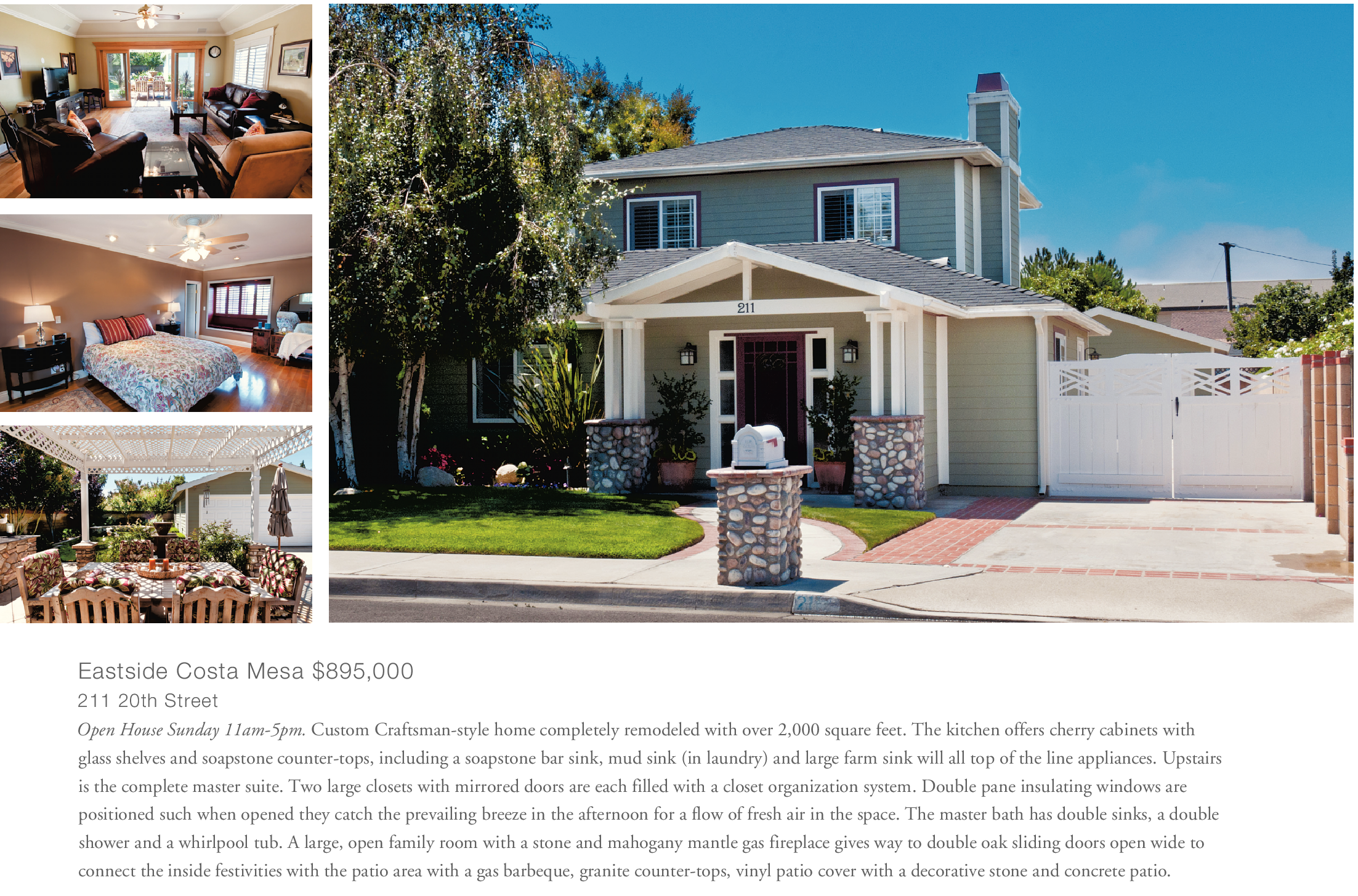 211 20th Street Open House Sunday 11am-5pm. Custom Craftsman-style home completely remodeled with over 2,000 square feet. The kitchen offers cherry cabinets with glass shelves and soapstone counter-tops, including a soapstone bar sink, mud sink (in laundry) and large farm sink will all top of the line appliances. Upstairs is the complete master suite. Two large closets with mirrored doors are each filled with a closet organization system. Double pane insulating windows are positioned such when opened they catch the prevailing breeze in the afternoon for a flow of fresh air in the space. The master bath has double sinks, a double shower and a whirlpool tub. A large, open family room with a stone and mahogany mantle gas fireplace gives way to double oak sliding doors open wide to connect the inside festivities with the patio area with a gas barbeque, granite counter-tops, vinyl patio cover with a decorative stone and concrete patio.