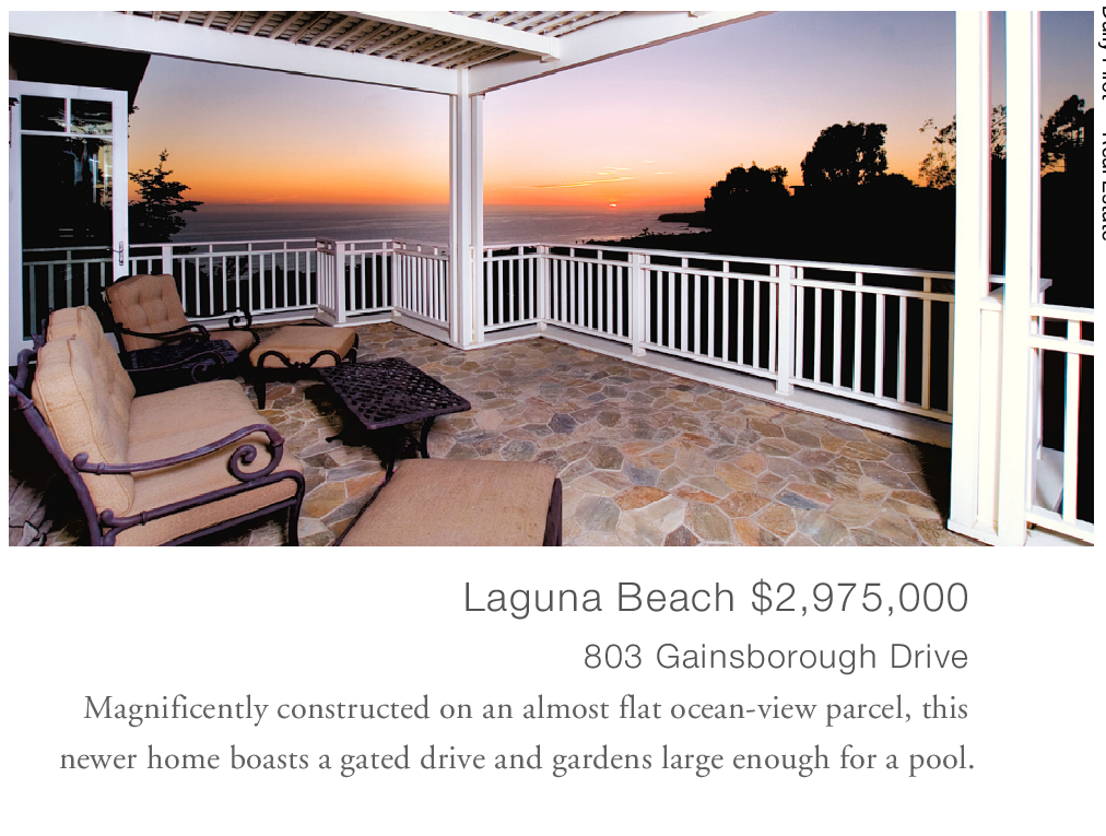 Laguna Beach $2,975,000 803 Gainsborough Drive Magnificently constructed on an almost flat ocean-view parcel, this newer home boasts a gated drive and gardens large enough for a pool.