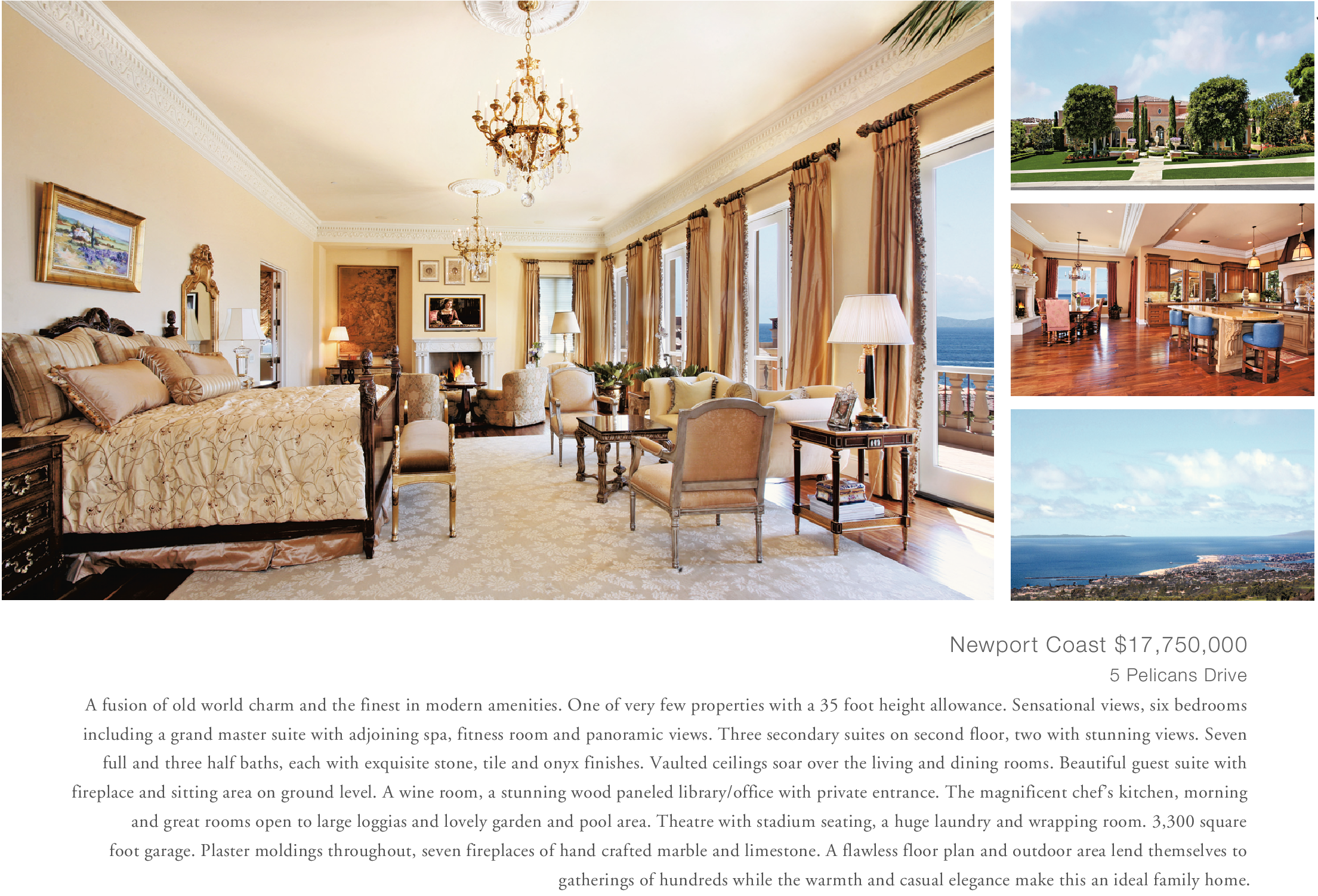 Newport Coast $17,750,000 5 Pelicans Drive A fusion of old world charm and the finest in modern amenities. One of very few properties with a 35 foot height allowance. Sensational views, six bedrooms including a grand master suite with adjoining spa, fitness room and panoramic views. Three secondary suites on second floor, two with stunning views. Seven full and three half baths, each with exquisite stone, tile and onyx finishes. Vaulted ceilings soar over the living and dining rooms. Beautiful guest suite with fireplace and sitting area on ground level. A wine room, a stunning wood paneled library/office with private entrance. The magnificent chef’s kitchen, morning and great rooms open to large loggias and lovely garden and pool area. Theatre with stadium seating, a huge laundry and wrapping room. 3,300 square foot garage. Plaster moldings throughout, seven fireplaces of hand crafted marble and limestone. A flawless floor plan and outdoor area lend themselves to gatherings of hundreds while the warmth and casual elegance make this an ideal family home.