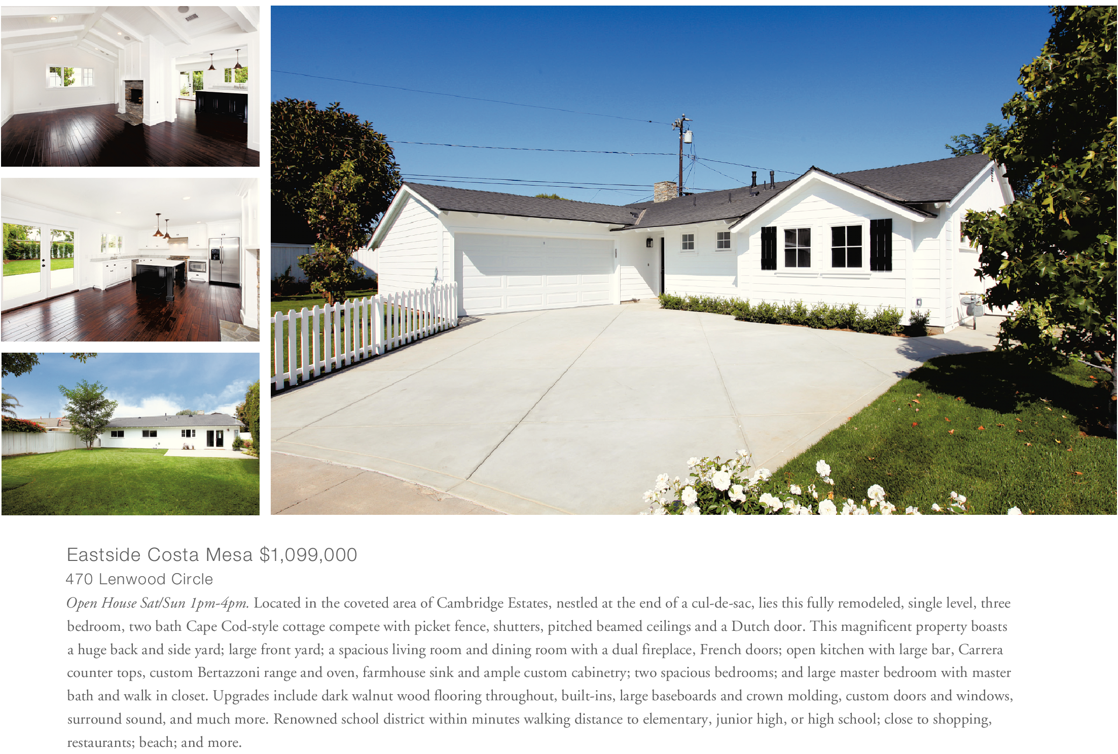 Eastside Costa Mesa $1,099,000 470 Lenwood Circle Open House Sat/Sun 1pm-4pm. Located in the coveted area of Cambridge Estates, nestled at the end of a cul-de-sac, lies this fully remodeled, single level, three bedroom, two bath Cape Cod-style cottage compete with picket fence, shutters, pitched beamed ceilings and a Dutch door. This magnificent property boasts a huge back and side yard; large front yard; a spacious living room and dining room with a dual fireplace, French doors; open kitchen with large bar, Carrera counter tops, custom Bertazzoni range and oven, farmhouse sink and ample custom cabinetry; two spacious bedrooms; and large master bedroom with master bath and walk in closet. Upgrades include dark walnut wood flooring throughout, built-ins, large baseboards and crown molding, custom doors and windows, surround sound, and much more. Renowned school district within minutes walking distance to elementary, junior high, or high school; close to shopping, restaurants; beach; and more.