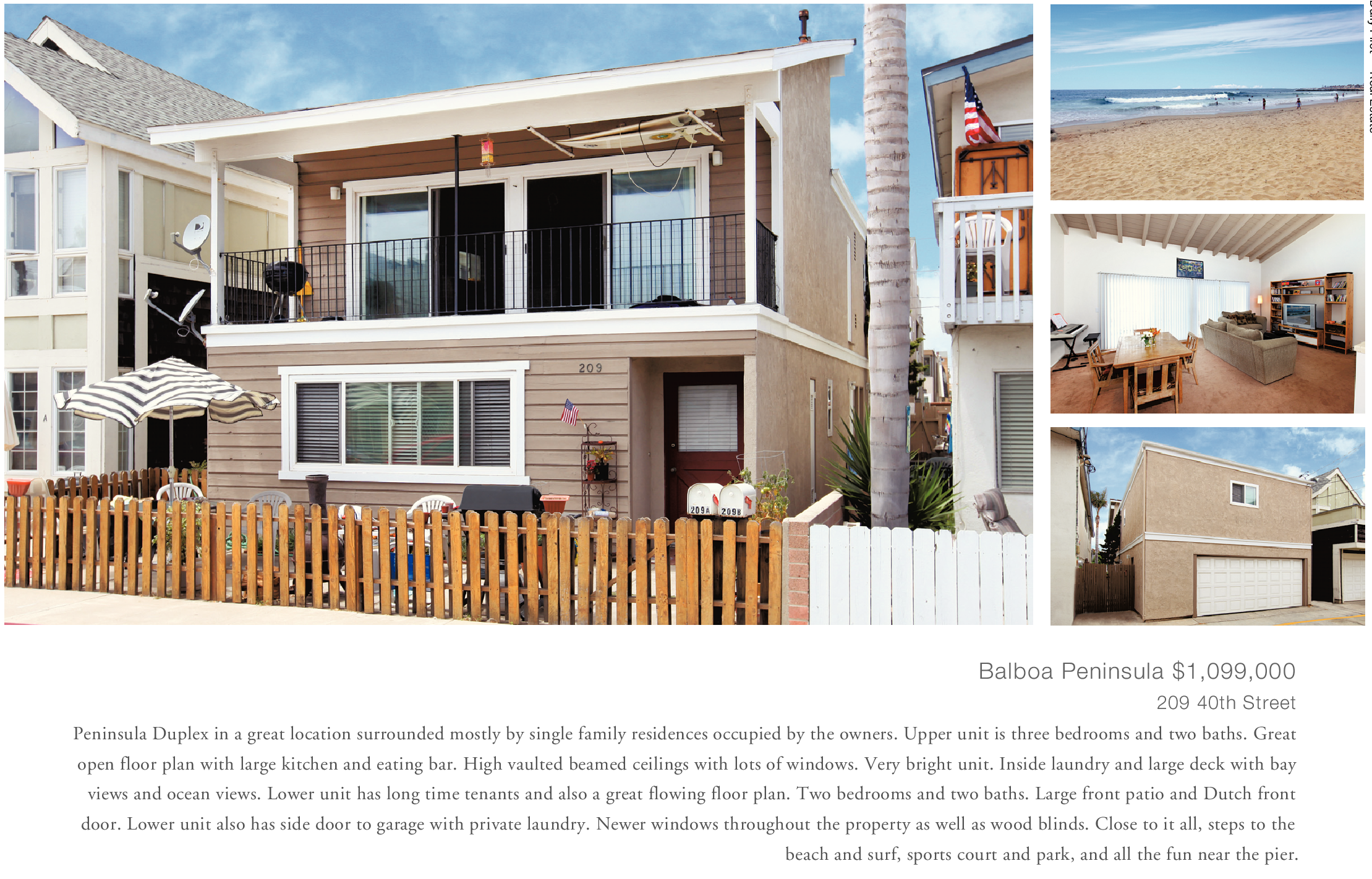 Balboa Peninsula $1,099,000 209 40th Street Peninsula Duplex in a great location surrounded mostly by single family residences occupied by the owners. Upper unit is three bedrooms and two baths. Great open floor plan with large kitchen and eating bar. High vaulted beamed ceilings with lots of windows. Very bright unit. Inside laundry and large deck with bay views and ocean views. Lower unit has long time tenants and also a great flowing floor plan. Two bedrooms and two baths. Large front patio and Dutch front door. Lower unit also has side door to garage with private laundry. Newer windows throughout the property as well as wood blinds. Close to it all, steps to the beach and surf, sports court and park, and all the fun near the pier.