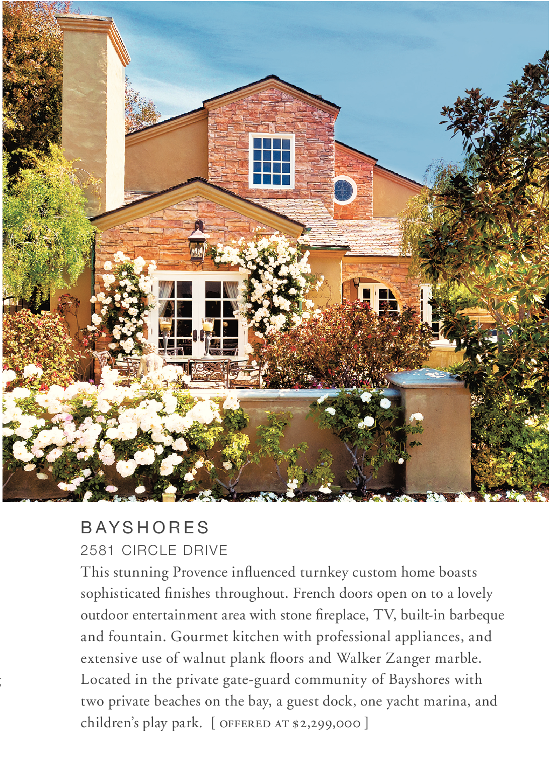 lighting B AYS H O R E S 2581 CIRCLE DRIVE This stunning Provence influenced turnkey custom home boasts sophisticated finishes throughout. French doors open on to a lovely outdoor entertainment area with stone fireplace, TV, built-in barbeque and fountain. Gourmet kitchen with professional appliances, and extensive use of walnut plank floors and Walker Zanger marble. Located in the private gate-guard community of Bayshores with two private beaches on the bay, a guest dock, one yacht marina, and children’s play park. [ offered at $2,299,000 ]