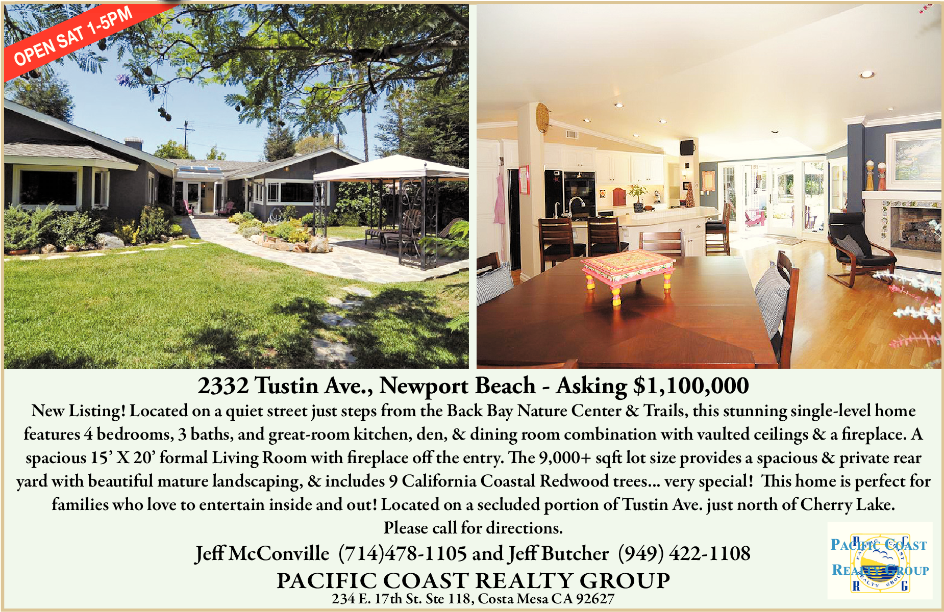 2332 Tustin Ave., Newport Beach - Asking $1,100,000 New Listing! Located on a quiet street just steps from the Back Bay Nature Center & Trails, this stunning single-level home features 4 bedrooms, 3 baths, and great-room kitchen, den, & dining room combination with vaulted ceilings & a fireplace. A spacious 15’ X 20’ formal Living Room with fireplace off the entry. The 9,000+ sqft lot size provides a spacious & private rear yard with beautiful mature landscaping, & includes 9 California Coastal Redwood trees... very special! This home is perfect for families who love to entertain inside and out! Located on a secluded portion of Tustin Ave. just north of Cherry Lake. Please call for directions. PACIFIC COAST Jeff McConville (714)478-1105 and Jeff Butcher (949) 422-1108 REALTY GROUP PACIFIC COAST REALTY GROUP 234 E. 17th St. Ste 118, Costa Mesa CA 92627