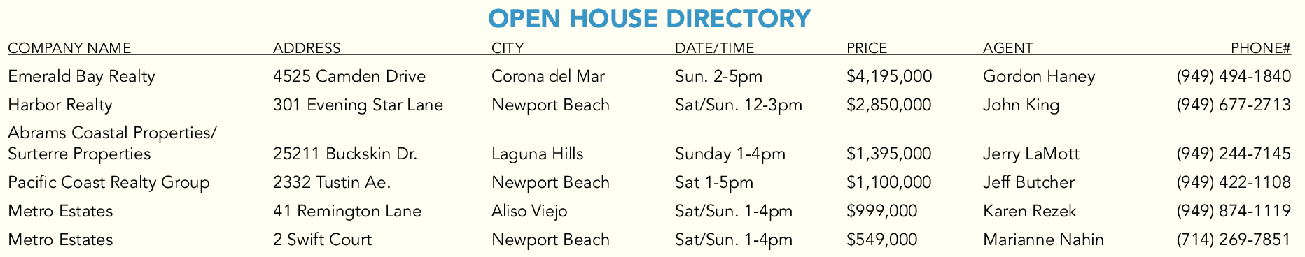 OPEN HOUSE DIRECTORY COMPANY NAME ADDRESS CITY DATE/TIME PRICE AGENT PHONE# Emerald Bay Realty 4525 Camden Drive Corona del Mar Sun. 2-5pm $4,195,000 Gordon Haney (949) 494-1840 Harbor Realty 301 Evening Star Lane Newport Beach Sat/Sun. 12-3pm $2,850,000 John King (949) 677-2713 Abrams Coastal Properties/ Surterre Properties 25211 Buckskin Dr. Laguna Hills Sunday 1-4pm $1,395,000 Jerry LaMott (949) 244-7145 Pacific Coast Realty Group 2332 Tustin Ae. Newport Beach Sat 1-5pm $1,100,000 Jeff Butcher (949) 422-1108 Metro Estates 41 Remington Lane Aliso Viejo Sat/Sun. 1-4pm $999,000 Karen Rezek (949) 874-1119 Metro Estates 2 Swift Court Newport Beach Sat/Sun. 1-4pm $549,000 Marianne Nahin (714) 269-7851