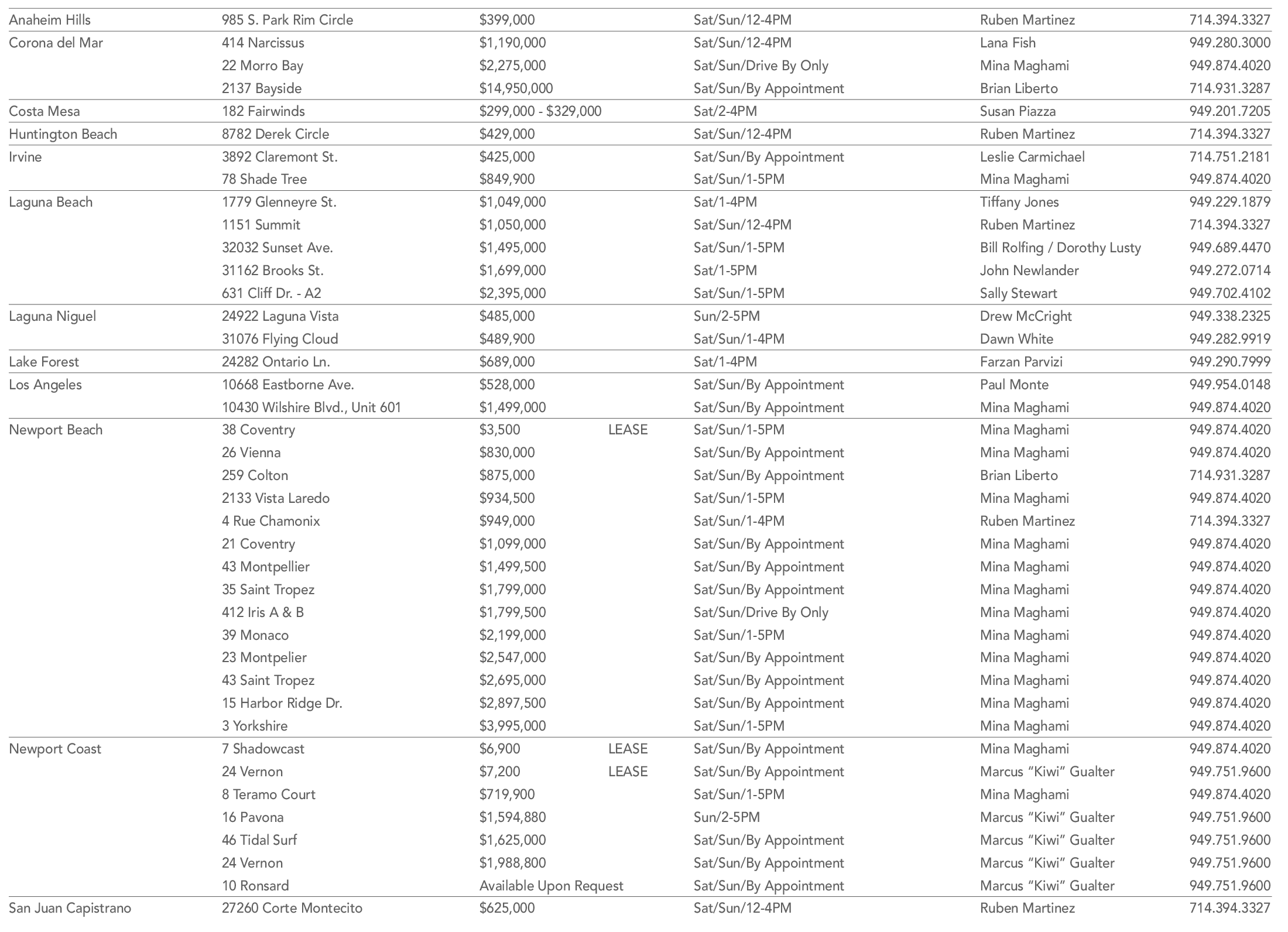 Anaheim Hills 985 S. Park Rim Circle $399,000 Sat/Sun/12-4PM Ruben Martinez 714.394.3327 Corona del Mar 414 Narcissus $1,190,000 Sat/Sun/12-4PM Lana Fish 949.280.3000 22 Morro Bay $2,275,000 Sat/Sun/Drive By Only Mina Maghami 949.874.4020 2137 Bayside $14,950,000 Sat/Sun/By Appointment Brian Liberto 714.931.3287 Costa Mesa 182 Fairwinds $299,000 - $329,000 Sat/2-4PM Susan Piazza 949.201.7205 Huntington Beach 8782 Derek Circle $429,000 Sat/Sun/12-4PM Ruben Martinez 714.394.3327 Irvine 3892 Claremont St. $425,000 Sat/Sun/By Appointment Leslie Carmichael 714.751.2181 78 Shade Tree $849,900 Sat/Sun/1-5PM Mina Maghami 949.874.4020 Laguna Beach 1779 Glenneyre St. $1,049,000 Sat/1-4PM Tiffany Jones 949.229.1879 1151 Summit $1,050,000 Sat/Sun/12-4PM Ruben Martinez 714.394.3327 32032 Sunset Ave. $1,495,000 Sat/Sun/1-5PM Bill Rolfing / Dorothy Lusty 949.689.4470 31162 Brooks St. $1,699,000 Sat/1-5PM John Newlander 949.272.0714 631 Cliff Dr. - A2 $2,395,000 Sat/Sun/1-5PM Sally Stewart 949.702.4102 Laguna Niguel 24922 Laguna Vista $485,000 Sun/2-5PM Drew McCright 949.338.2325 31076 Flying Cloud $489,900 Sat/Sun/1-4PM Dawn White 949.282.9919 Lake Forest 24282 Ontario Ln. $689,000 Sat/1-4PM Farzan Parvizi 949.290.7999 Los Angeles 10668 Eastborne Ave. $528,000 Sat/Sun/By Appointment Paul Monte 949.954.0148 10430 Wilshire Blvd., Unit 601 $1,499,000 Sat/Sun/By Appointment Mina Maghami 949.874.4020 Newport Beach 38 Coventry $3,500 LEASE Sat/Sun/1-5PM Mina Maghami 949.874.4020 26 Vienna $830,000 Sat/Sun/By Appointment Mina Maghami 949.874.4020 259 Colton $875,000 Sat/Sun/By Appointment Brian Liberto 714.931.3287 2133 Vista Laredo $934,500 Sat/Sun/1-5PM Mina Maghami 949.874.4020 4 Rue Chamonix $949,000 Sat/Sun/1-4PM Ruben Martinez 714.394.3327 21 Coventry $1,099,000 Sat/Sun/By Appointment Mina Maghami 949.874.4020 43 Montpellier $1,499,500 Sat/Sun/By Appointment Mina Maghami 949.874.4020 35 Saint Tropez $1,799,000 Sat/Sun/By Appointment Mina Maghami 949.874.4020 412 Iris A & B $1,799,500 Sat/Sun/Drive By Only Mina Maghami 949.874.4020 39 Monaco $2,199,000 Sat/Sun/1-5PM Mina Maghami 949.874.4020 23 Montpelier $2,547,000 Sat/Sun/By Appointment Mina Maghami 949.874.4020 43 Saint Tropez $2,695,000 Sat/Sun/By Appointment Mina Maghami 949.874.4020 15 Harbor Ridge Dr. $2,897,500 Sat/Sun/By Appointment Mina Maghami 949.874.4020 3 Yorkshire $3,995,000 Sat/Sun/1-5PM Mina Maghami 949.874.4020 Newport Coast 7 Shadowcast $6,900 LEASE Sat/Sun/By Appointment Mina Maghami 949.874.4020 24 Vernon $7,200 LEASE Sat/Sun/By Appointment Marcus “Kiwi” Gualter 949.751.9600 8 Teramo Court $719,900 Sat/Sun/1-5PM Mina Maghami 949.874.4020 16 Pavona $1,594,880 Sun/2-5PM Marcus “Kiwi” Gualter 949.751.9600 46 Tidal Surf $1,625,000 Sat/Sun/By Appointment Marcus “Kiwi” Gualter 949.751.9600 24 Vernon $1,988,800 Sat/Sun/By Appointment Marcus “Kiwi” Gualter 949.751.9600 10 Ronsard Available Upon Request Sat/Sun/By Appointment Marcus “Kiwi” Gualter 949.751.9600 San Juan Capistrano 27260 Corte Montecito $625,000 Sat/Sun/12-4PM Ruben Martinez 714.394.3327