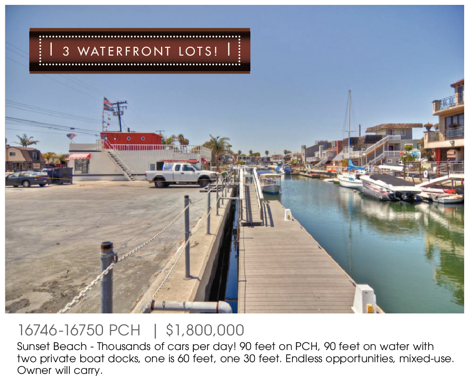 16746-16750 PCH | $1,800,000 Sunset Beach - Thousands of cars per day! 90 feet on PCH, 90 feet on water with two private boat docks, one is 60 feet, one 30 feet. Endless opportunities, mixed-use. Owner will carry.