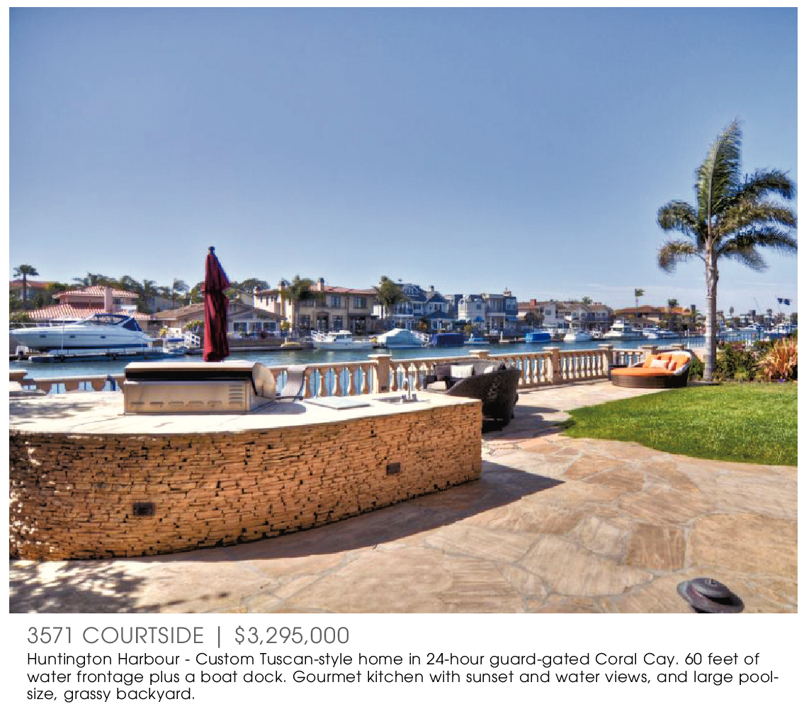 3571 COURTSIDE | $3,295,000 Huntington Harbour - Custom Tuscan-style home in 24-hour guard-gated Coral Cay. 60 feet of water frontage plus a boat dock. Gourmet kitchen with sunset and water views, and large poolsize, grassy backyard.