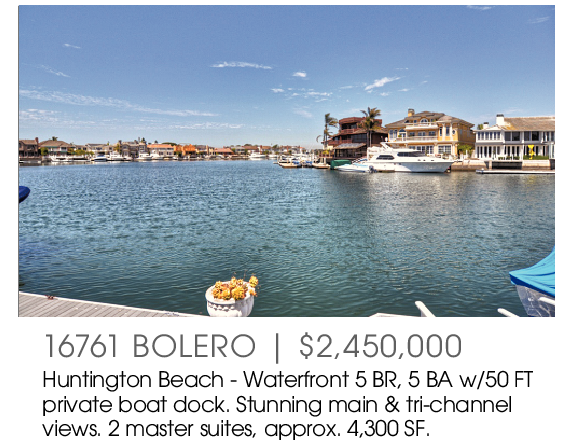 16761 BOLERO | $2,450,000 Huntington Beach - Waterfront 5 BR, 5 BA w/50 FT private boat dock. Stunning main & tri-channel views. 2 master suites, approx. 4,300 SF.