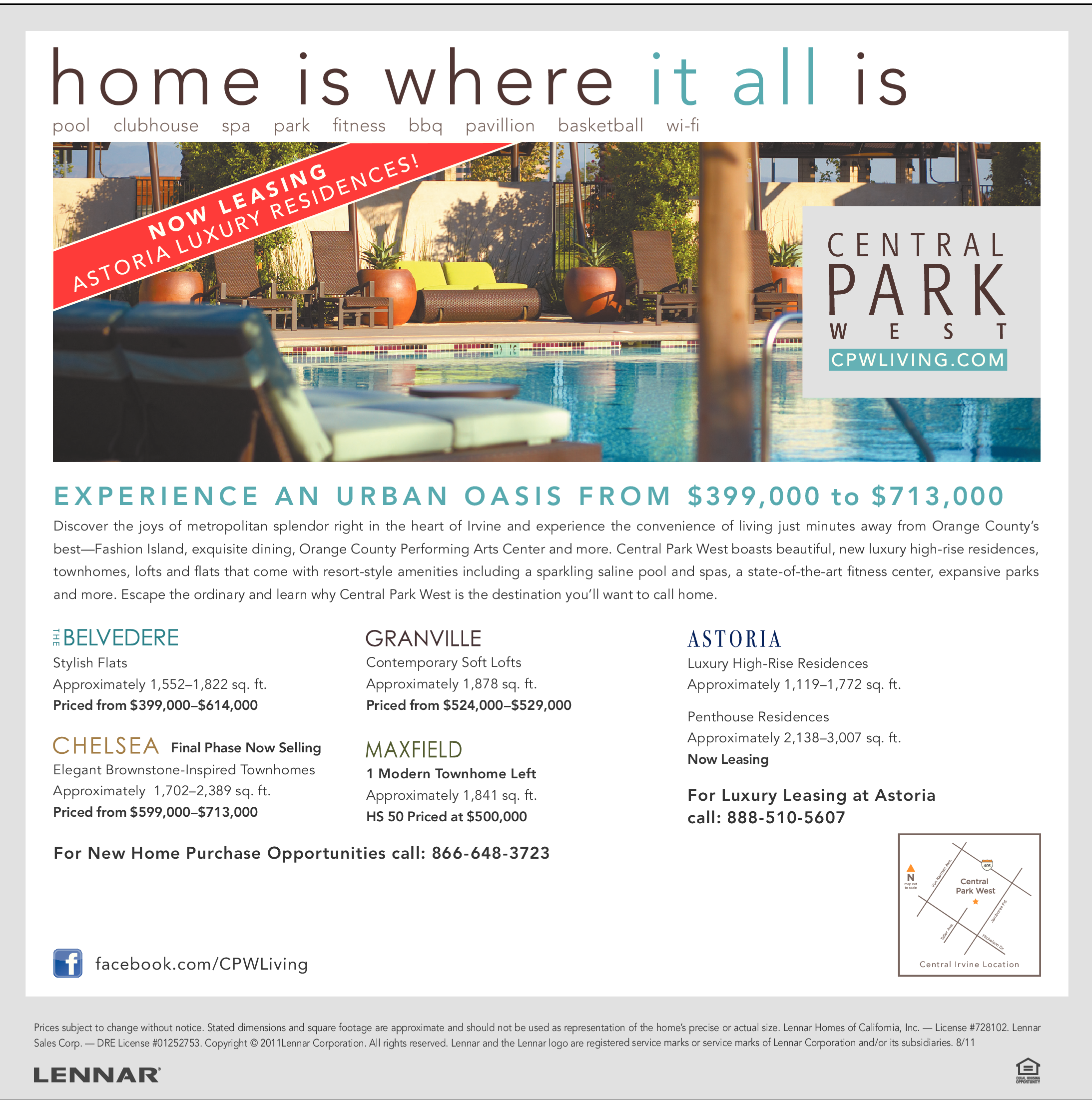 Discover the joys of metropolitan splendor right in the heart of Irvine and experience the convenience of living just minutes away from Orange County’s best—Fashion Island, exquisite dining, Orange County Performing Arts Center and more. Central Park West boasts beautiful, new luxury high-rise residences, townhomes, lofts and flats that come with resort-style amenities including a sparkling saline pool and spas, a state-of-the-art fitness center, expansive parks and more. Escape the ordinary and learn why Central Park West is the destination you’ll want to call home.
