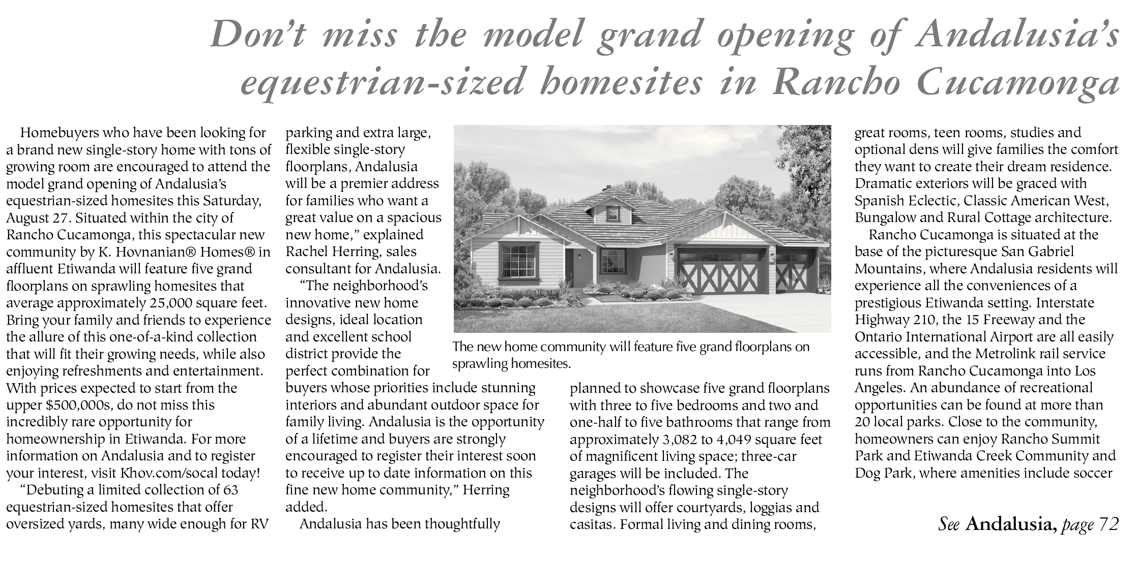 Homebuyers who have been looking for a brand new single-story home with tons of growing room are encouraged to attend the model grand opening of Andalusia’s equestrian-sized homesites this Saturday, August 27. Situated within the city of Rancho Cucamonga, this spectacular new community by K. Hovnanian® Homes® in affluent Etiwanda will feature five grand floorplans on sprawling homesites that average approximately 25,000 square feet. Bring your family and friends to experience the allure of this one-of-a-kind collection that will fit their growing needs, while also enjoying refreshments and entertainment. With prices expected to start from the upper $500,000s, do not miss this incredibly rare opportunity for homeownership in Etiwanda. For more information on Andalusia and to register your interest, visit Khov.com/socal today!
