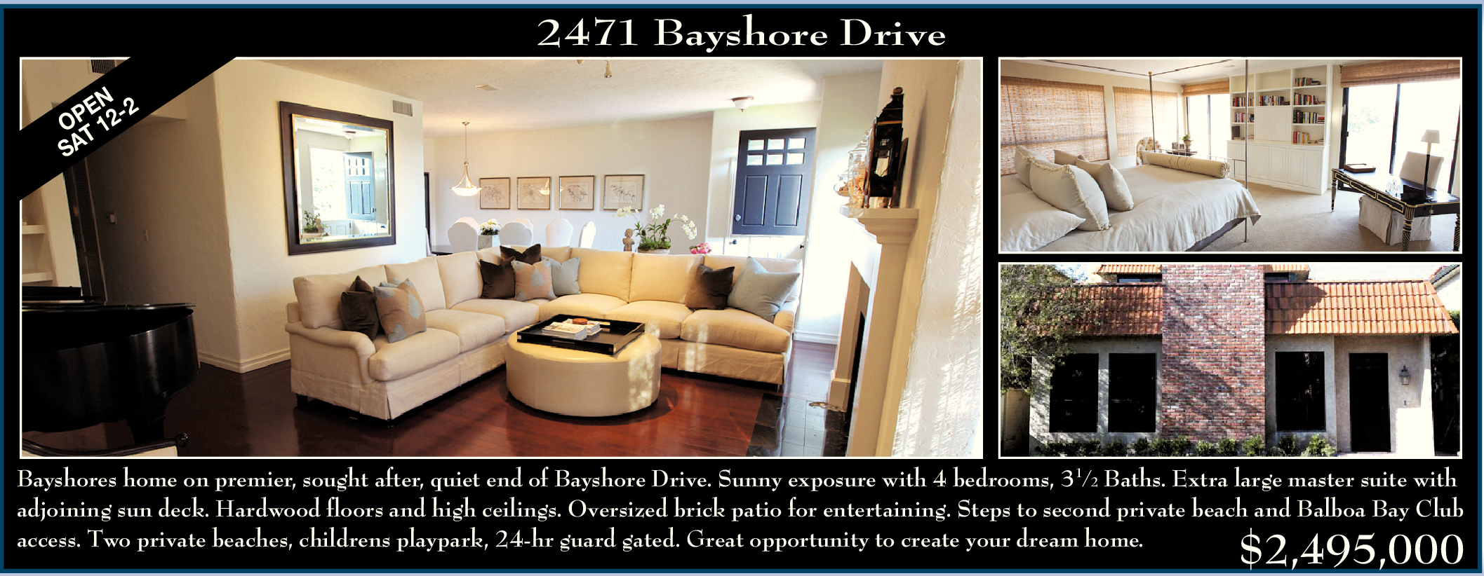 2471 Bayshore Drive Bayshores home on premier, sought after, quiet end of Bayshore Drive. Sunny exposure with 4 bedrooms, 3 1 ⁄2 Baths. Extra large master suite with adjoining sun deck. Hardwood floors and high ceilings. Oversized brick patio for entertaining. Steps to second private beach and Balboa Bay Club access. Two private beaches, childrens playpark, 24-hr guard gated. Great opportunity to create your dream home. $2,495,000
