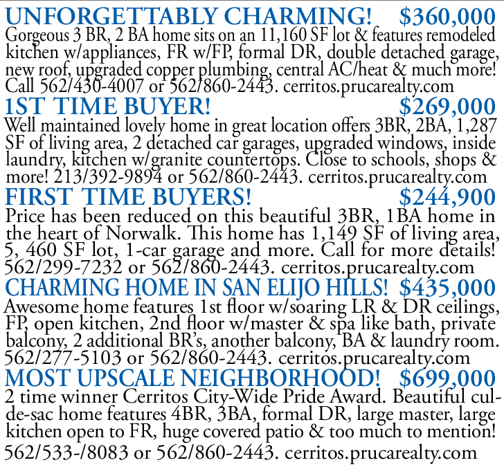 Call 562/430-4007 or 562/860-2443. cerritos.prucarealty.com 1ST TIME BUYER! $269,000 Well maintained lovely home in great location offers 3BR, 2BA, 1,287 SF of living area, 2 detached car garages, upgraded windows, inside laundry, kitchen w/granite countertops. Close to schools, shops & more! 213/392-9894 or 562/860-2443. cerritos.prucarealty.com FIRST TIME BUYERS! $244,900 Price has been reduced on this beautiful 3BR, 1BA home in the heart of Norwalk. This home has 1,149 SF of living area, 5, 460 SF lot, 1-car garage and more. Call for more details! 562/299-7232 or 562/860-2443. cerritos.prucarealty.com CHARMING HOME IN SAN ELIJO HILLS! $435,000 Awesome home features 1st floor w/soaring LR & DR ceilings, FP, open kitchen, 2nd floor w/master & spa like bath, private balcony, 2 additional BR’s, another balcony, BA & laundry room. 562/277-5103 or 562/860-2443. cerritos.prucarealty.com MOST UPSCALE NEIGHBORHOOD! $699,000 2 time winner Cerritos City-Wide Pride Award. Beautiful culde-sac home features 4BR, 3BA, formal DR, large master, large kitchen open to FR, huge covered patio & too much to mention!