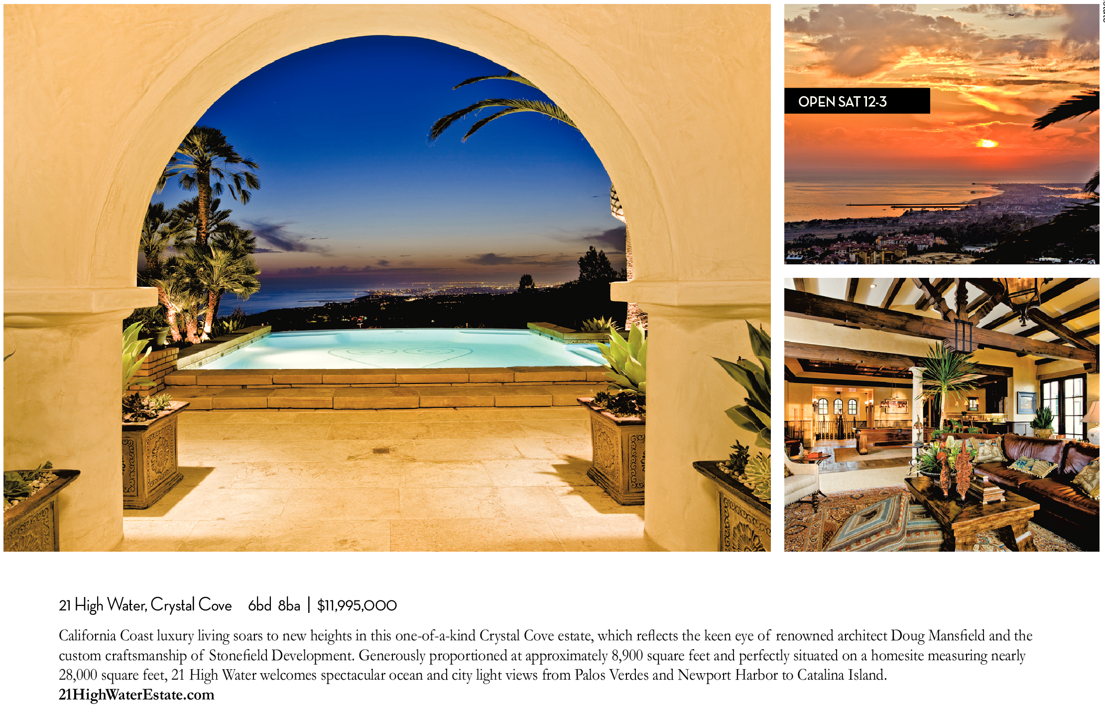 21 High Water, Crystal Cove 6bd 8ba | $11,995,000 California Coast luxury living soars to new heights in this one-of-a-kind Crystal Cove estate, which reflects the keen eye of renowned architect Doug Mansfield and the custom craftsmanship of Stonefield Development. Generously proportioned at approximately 8,900 square feet and perfectly situated on a homesite measuring nearly 28,000 square feet, 21 High Water welcomes spectacular ocean and city light views from Palos Verdes and Newport Harbor to Catalina Island. 21HighWaterEstate.com OPEN SAT 12-3