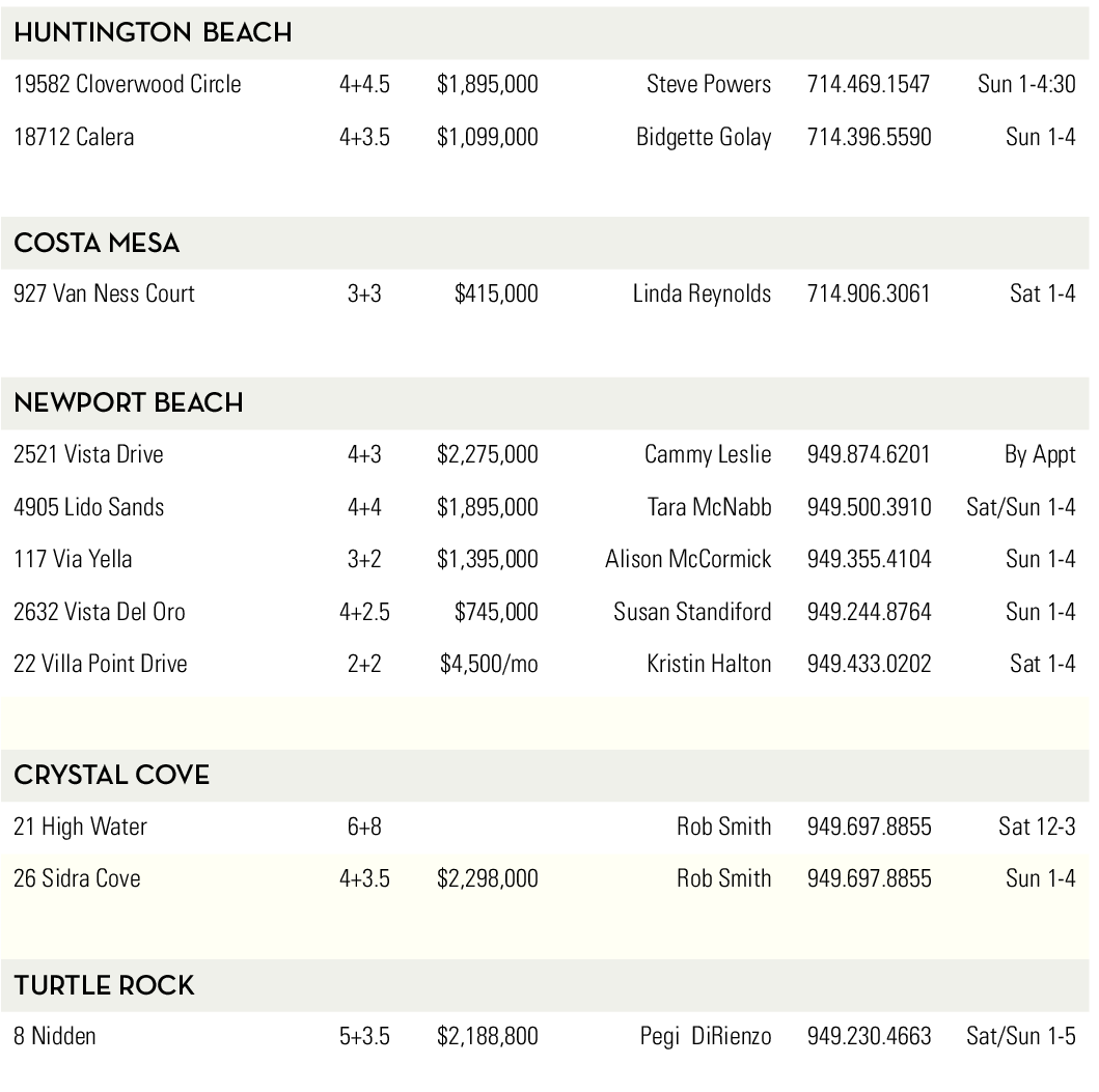 26 Sidra Cove 4+3.5 $2,298,000 Rob Smith 949.697.8855 Sun 1-4
