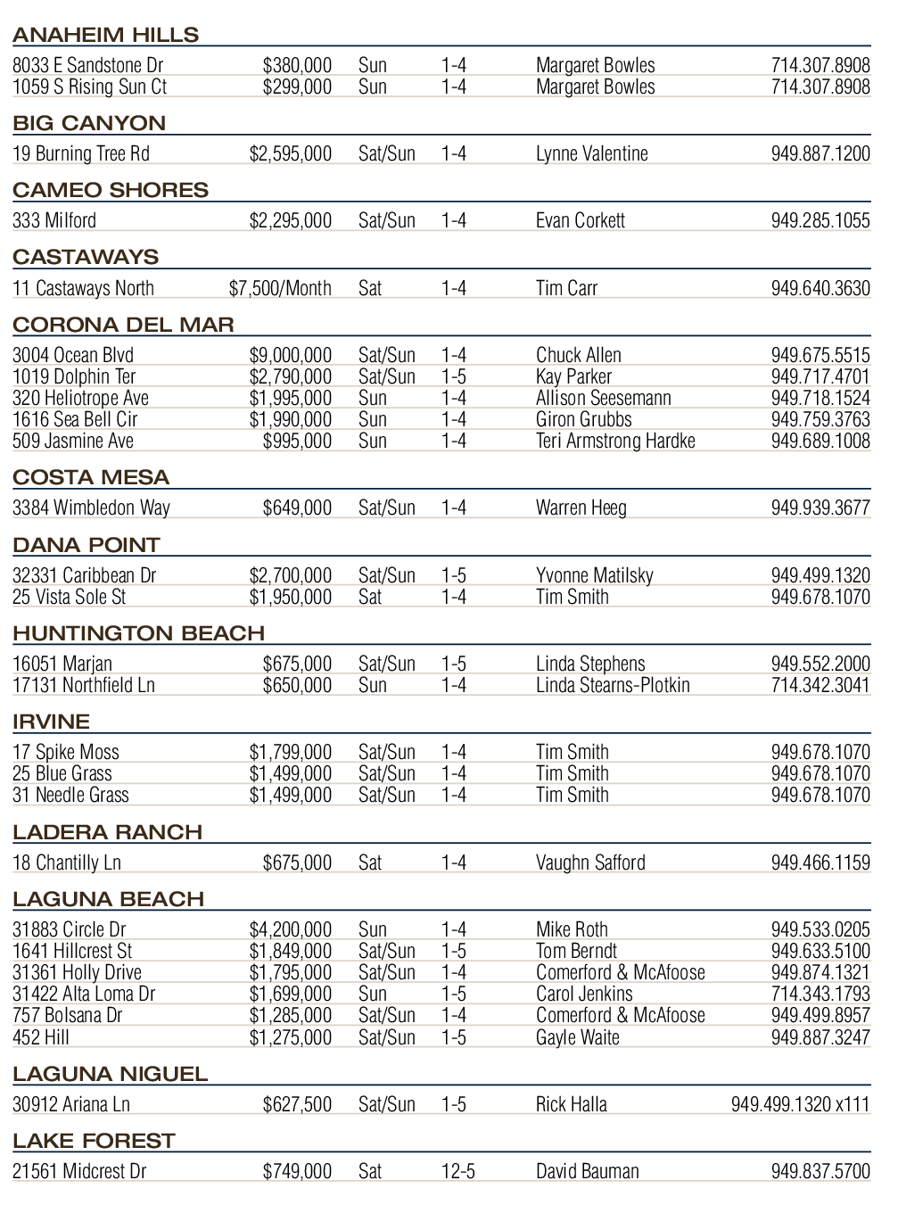 LAGUNA BEACH 31883 Circle Dr $4,200,000 Sun 1-4 Mike Roth 949.533.0205 1641 Hillcrest St $1,849,000 Sat/Sun 1-5 Tom Berndt 949.633.5100 31361 Holly Drive $1,795,000 Sat/Sun 1-4 Comerford & McAfoose 949.874.1321 31422 Alta Loma Dr $1,699,000 Sun 1-5 Carol Jenkins 714.343.1793 757 Bolsana Dr $1,285,000 Sat/Sun 1-4 Comerford & McAfoose 949.499.8957 452 Hill $1,275,000 Sat/Sun 1-5 Gayle Waite 949.887.3247