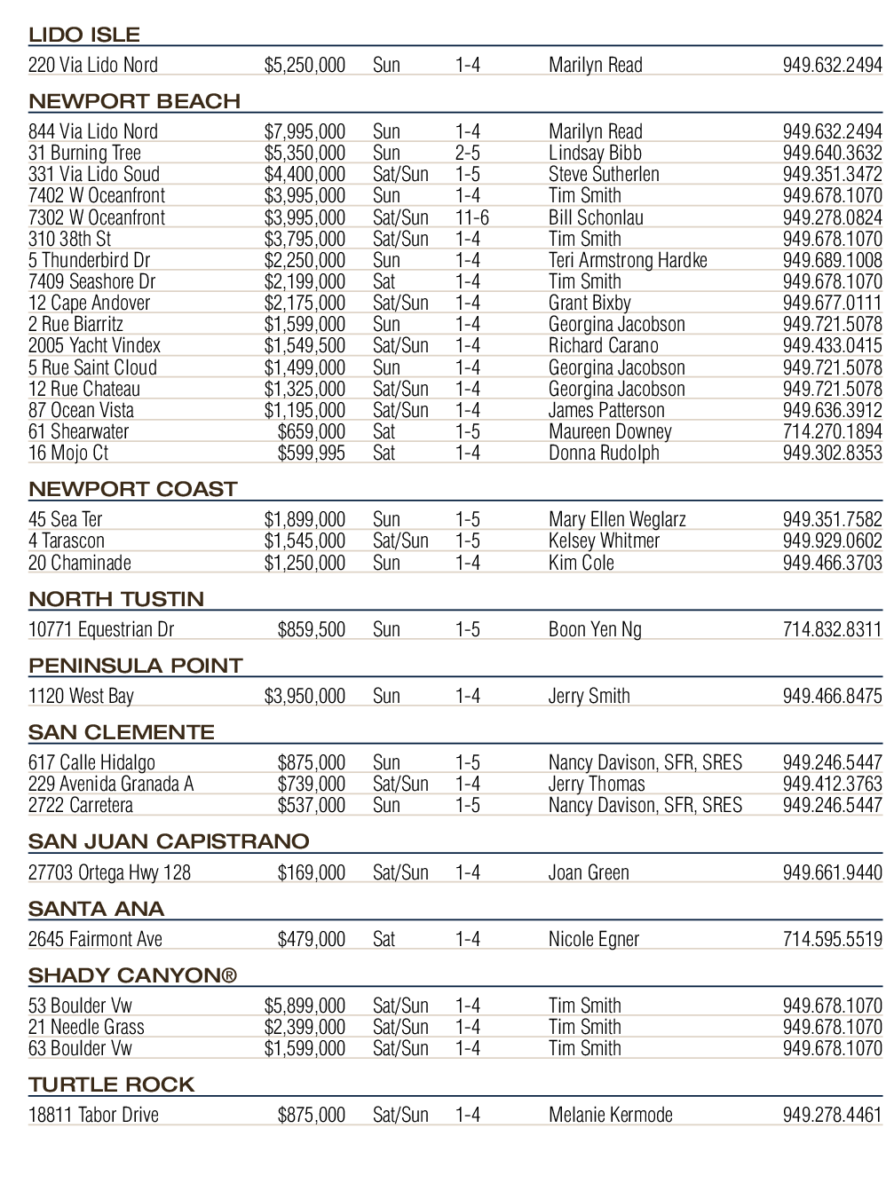 NEWPORT BEACH 844 Via Lido Nord $7,995,000 Sun 1-4 Marilyn Read 949.632.2494 31 Burning Tree $5,350,000 Sun 2-5 Lindsay Bibb 949.640.3632 331 Via Lido Soud $4,400,000 Sat/Sun 1-5 Steve Sutherlen 949.351.3472 7402 W Oceanfront $3,995,000 Sun 1-4 Tim Smith 949.678.1070 7302 W Oceanfront $3,995,000 Sat/Sun 11-6 Bill Schonlau 949.278.0824 310 38th St $3,795,000 Sat/Sun 1-4 Tim Smith 949.678.1070 5 Thunderbird Dr $2,250,000 Sun 1-4 Teri Armstrong Hardke 949.689.1008 7409 Seashore Dr $2,199,000 Sat 1-4 Tim Smith 949.678.1070 12 Cape Andover $2,175,000 Sat/Sun 1-4 Grant Bixby 949.677.0111 2 Rue Biarritz $1,599,000 Sun 1-4 Georgina Jacobson 949.721.5078 2005 Yacht Vindex $1,549,500 Sat/Sun 1-4 Richard Carano 949.433.0415 5 Rue Saint Cloud $1,499,000 Sun 1-4 Georgina Jacobson 949.721.5078 12 Rue Chateau $1,325,000 Sat/Sun 1-4 Georgina Jacobson 949.721.5078 87 Ocean Vista $1,195,000 Sat/Sun 1-4 James Patterson 949.636.3912 61 Shearwater $659,000 Sat 1-5 Maureen Downey 714.270.1894 16 Mojo Ct $599,995 Sat 1-4 Donna Rudolph 949.302.8353
