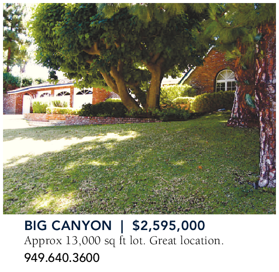BIG CANYON | $2,595,000 Approx 13,000 sq ft lot. Great location. 949.640.3600