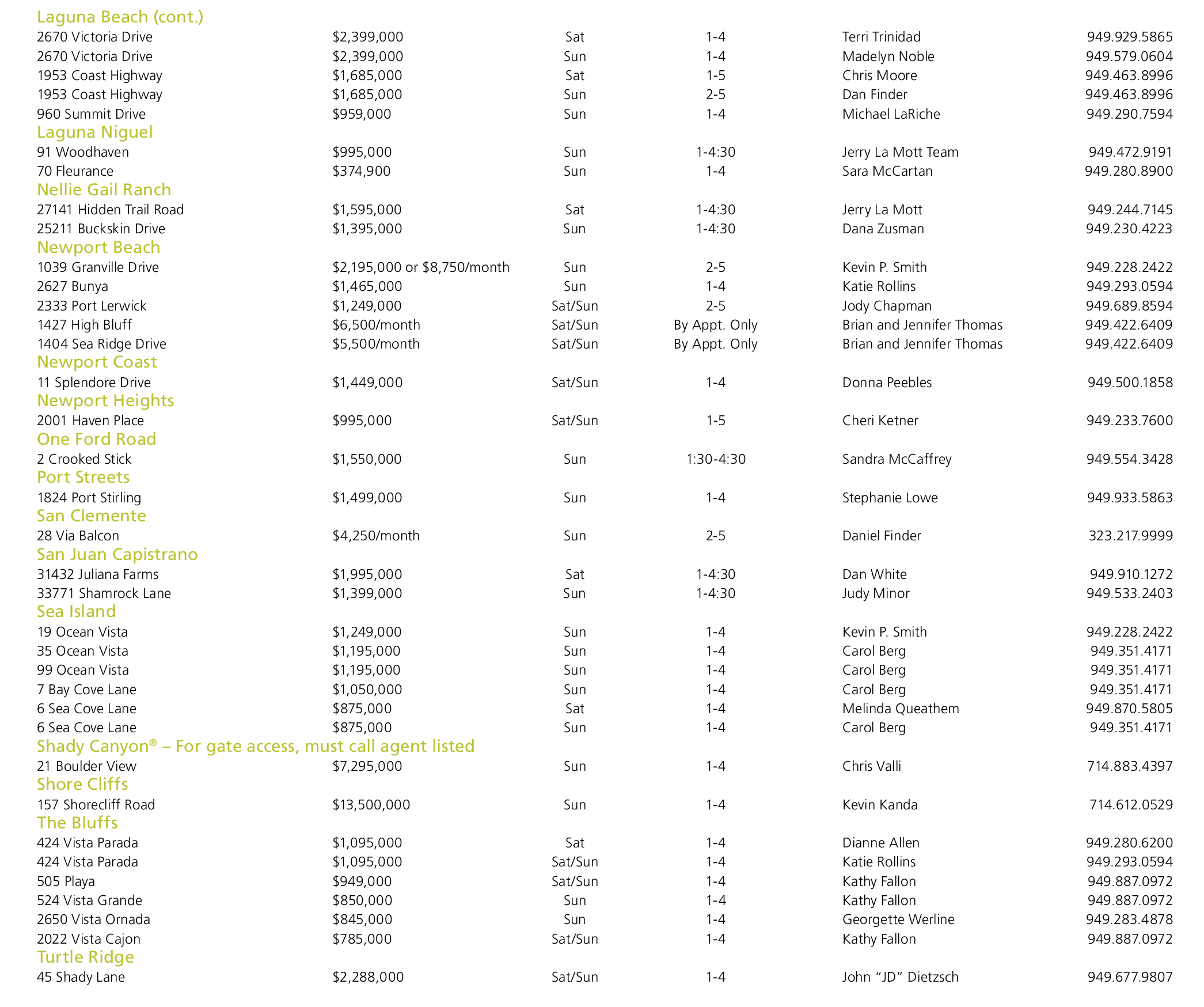 Laguna Beach (cont.) 2670 Victoria Drive $2,399,000 Sat 1-4 Terri Trinidad 949.929.5865 2670 Victoria Drive $2,399,000 Sun 1-4 Madelyn Noble 949.579.0604 1953 Coast Highway $1,685,000 Sat 1-5 Chris Moore 949.463.8996 1953 Coast Highway $1,685,000 Sun 2-5 Dan Finder 949.463.8996 960 Summit Drive $959,000 Sun 1-4 Michael LaRiche 949.290.7594 Laguna Niguel 91 Woodhaven $995,000 Sun 1-4:30 Jerry La Mott Team 949.472.9191 70 Fleurance $374,900 Sun 1-4 Sara McCartan 949.280.8900 Nellie Gail Ranch 27141 Hidden Trail Road $1,595,000 Sat 1-4:30 Jerry La Mott 949.244.7145 25211 Buckskin Drive $1,395,000 Sun 1-4:30 Dana Zusman 949.230.4223 Newport Beach 1039 Granville Drive $2,195,000 or $8,750/month Sun 2-5 Kevin P. Smith 949.228.2422 2627 Bunya $1,465,000 Sun 1-4 Katie Rollins 949.293.0594 2333 Port Lerwick $1,249,000 Sat/Sun 2-5 Jody Chapman 949.689.8594 1427 High Bluff $6,500/month Sat/Sun By Appt. Only Brian and Jennifer Thomas 949.422.6409 1404 Sea Ridge Drive $5,500/month Sat/Sun By Appt. Only Brian and Jennifer Thomas 949.422.6409 Newport Coast 11 Splendore Drive $1,449,000 Sat/Sun 1-4 Donna Peebles 949.500.1858 Newport Heights 2001 Haven Place $995,000 Sat/Sun 1-5 Cheri Ketner 949.233.7600 One Ford Road 2 Crooked Stick $1,550,000 Sun 1:30-4:30 Sandra McCaffrey 949.554.3428 Port Streets 1824 Port Stirling $1,499,000 Sun 1-4 Stephanie Lowe 949.933.5863 San Clemente 28 Via Balcon $4,250/month Sun 2-5 Daniel Finder 323.217.9999 San Juan Capistrano 31432 Juliana Farms $1,995,000 Sat 1-4:30 Dan White 949.910.1272 33771 Shamrock Lane $1,399,000 Sun 1-4:30 Judy Minor 949.533.2403 Sea Island 19 Ocean Vista $1,249,000 Sun 1-4 Kevin P. Smith 949.228.2422 35 Ocean Vista $1,195,000 Sun 1-4 Carol Berg 949.351.4171 99 Ocean Vista $1,195,000 Sun 1-4 Carol Berg 949.351.4171 7 Bay Cove Lane $1,050,000 Sun 1-4 Carol Berg 949.351.4171 6 Sea Cove Lane $875,000 Sat 1-4 Melinda Queathem 949.870.5805 6 Sea Cove Lane $875,000 Sun 1-4 Carol Berg 949.351.4171 Shady Canyon ® – For gate access, must call agent listed 21 Boulder View $7,295,000 Sun 1-4 Chris Valli 714.883.4397 Shore Cliffs 157 Shorecliff Road $13,500,000 Sun 1-4 Kevin Kanda 714.612.0529 The Bluffs 424 Vista Parada $1,095,000 Sat 1-4 Dianne Allen 949.280.6200 424 Vista Parada $1,095,000 Sat/Sun 1-4 Katie Rollins 949.293.0594 505 Playa $949,000 Sat/Sun 1-4 Kathy Fallon 949.887.0972 524 Vista Grande $850,000 Sun 1-4 Kathy Fallon 949.887.0972 2650 Vista Ornada $845,000 Sun 1-4 Georgette Werline 949.283.4878 2022 Vista Cajon $785,000 Sat/Sun 1-4 Kathy Fallon 949.887.0972 Turtle Ridge 45 Shady Lane $2,288,000 Sat/Sun 1-4 John “JD” Dietzsch 949.677.9807