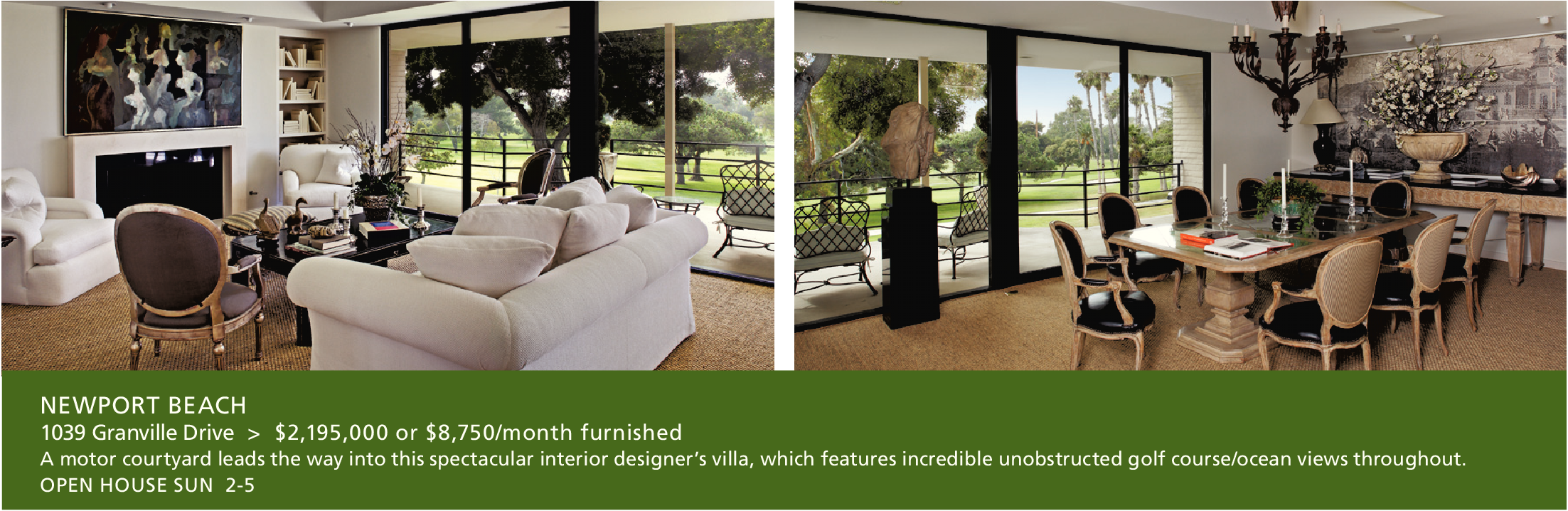 NEWPORT BEACH 1039 Granville Drive > $2,195,000 or $8,750/month furnished A motor courtyard leads the way into this spectacular interior designer’s villa, which features incredible unobstructed golf course/ocean views throughout. OPEN HOUSE SUN 2-5