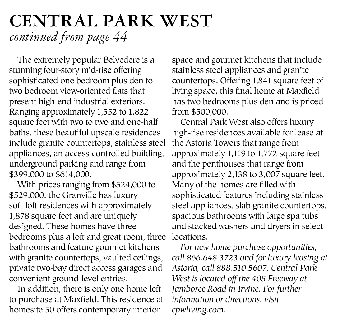 For new home purchase opportunities, call 866.648.3723 and for luxury leasing at Astoria, call 888.510.5607. Central Park West is located off the 405 Freeway at Jamboree Road in Irvine. For further information or directions, visit cpwliving.com.