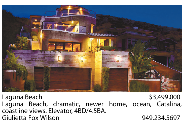 Laguna Beach $3,499,000 Laguna Beach, dramatic, newer home, ocean, Catalina, coastline views. Elevator, 4BD/4.5BA. Giulietta Fox Wilson 949.234.5697