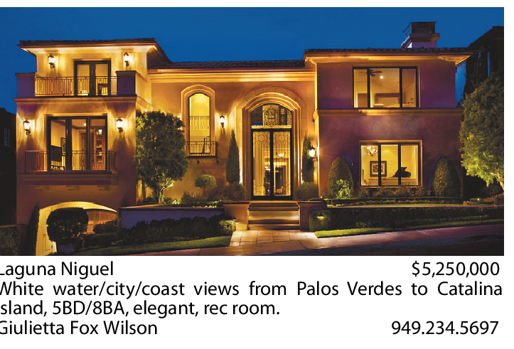 Laguna Niguel $5,250,000 White water/city/coast views from Palos Verdes to Catalina Island, 5BD/8BA, elegant, rec room. Giulietta Fox Wilson 949.234.5697