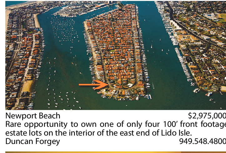 Newport Beach $2,975,000 Rare opportunity to own one of only four 100’ front footage estate lots on the interior of the east end of Lido Isle. Duncan Forgey 949.548.4800