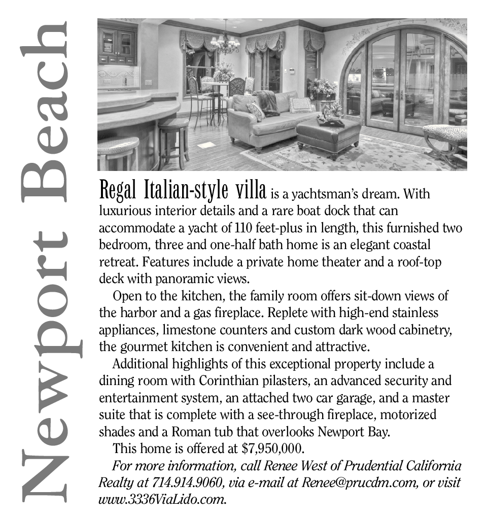 Regal Italian-style villa is a yachtsman’s dream. With luxurious interior details and a rare boat dock that can accommodate a yacht of 110 feet-plus in length, this furnished two bedroom, three and one-half bath home is an elegant coastal retreat. Features include a private home theater and a roof-top deck with panoramic views. Open to the kitchen, the family room offers sit-down views of the harbor and a gas fireplace. Replete with high-end stainless appliances, limestone counters and custom dark wood cabinetry, the gourmet kitchen is convenient and attractive. Additional highlights of this exceptional property include a dining room with Corinthian pilasters, an advanced security and entertainment system, an attached two car garage, and a master suite that is complete with a see-through fireplace, motorized shades and a Roman tub that overlooks Newport Bay. This home is offered at $7,950,000. For more information, call Renee West of Prudential California Realty at 714.914.9060, via e-mail at Renee@prucdm.com, or visit www.3336ViaLido.com.