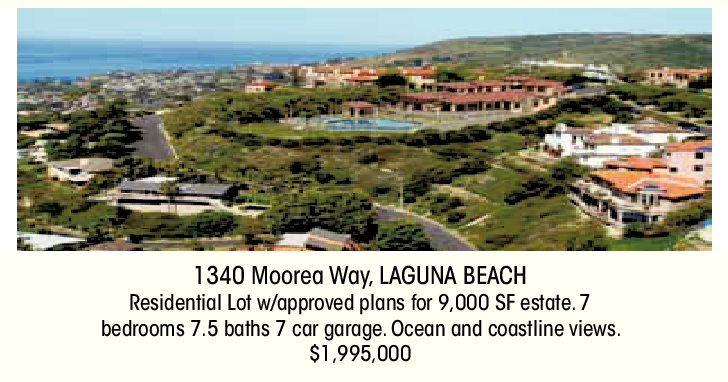 1340 1340 Moorea Way, LAGUNA BEACH BEACH Residential Lot w/approved plans for 9,000 SF estate. 7 Residential Lot w/approved plans for 9,000 SF estate. 7 bedrooms 7.5 baths 7 car garage. Ocean and coastline views. bedrooms 7.5 baths 7 car garage. Ocean and coastline views. $1,995,000 $1,995,000