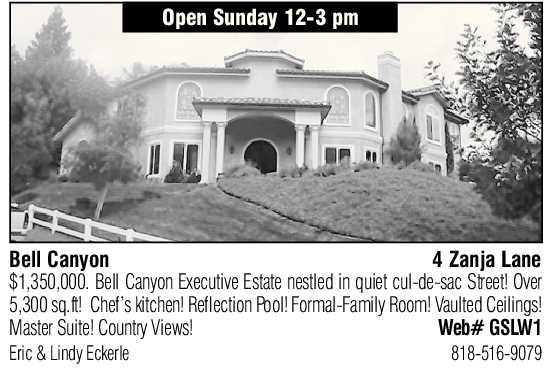 Open Sunday 12-3 pm Bell Canyon 4 Zanja Lane 5,300 sq.ft! Chef’s kitchen! Reflection Pool! Formal-Family Room! Vaulted Ceilings! $1,350,000. Bell Canyon Executive Estate nestled in quiet cul-de-sac Street! Over Master Suite! Country Views! Web# GSLW1 Eric & Lindy Eckerle 818-516-9079