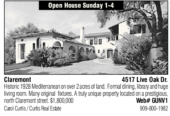 Open House Sunday 1-4 Claremont 4517 Live Oak Dr. living room. Many original fixtures. A truly unique property located on a prestigious, Historic 1928 Mediterranean on over 2 acres of land. Formal dining, library and huge north Claremont street. $1,800,000 Web# GUNV1 Carol Curtis / Curtis Real Estate 909-800-1982 See also