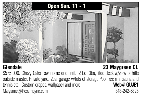 Open Sun. 11 - 1 Glendale 23 Maygreen Ct. outside master. Private yard. 2car garage w/lots of storage.Pool, rec rm, sauna and $575,000. Chevy Oaks Townhome end unit. 2 bd, 3ba, tiled deck w/view of hills tennis cts. Custom drapes, wallpaper and more Web# GUJE1 Maryanne@Rossmoyne.com 818-242-6825
