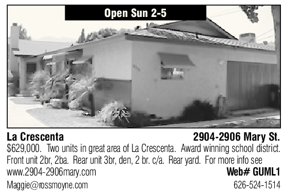 Open Sun 2-5 La Crescenta 2904-2906 Mary St. Front unit 2br, 2ba. Rear unit 3br, den, 2 br. c/a. Rear yard. For more info see $629,000. Two units in great area of La Crescenta. Award winning school district. www.2904-2906mary.com Web# GUML1 Maggie@rossmoyne.com 626-524-1514