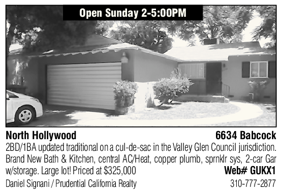 Open Sunday 2-5:00PM North Hollywood 6634 Babcock 2BD/1BA updated traditional on a cul-de-sac in the Valley Glen Council jurisdiction. Brand New Bath & Kitchen, central AC/Heat, copper plumb, sprnklr sys, 2-car Gar w/storage. Large lot! Priced at $325,000 Web# GUKX1 Daniel Signani / Prudential California Realty 310-777-2877