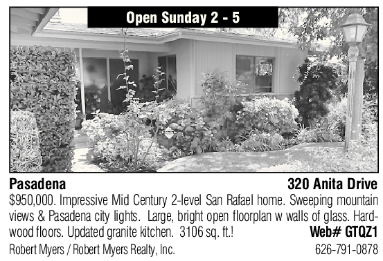 Open Sunday 2 - 5 Pasadena 320 Anita Drive $950,000. Impressive Mid Century 2-level San Rafael home. Sweeping mountain views & Pasadena city lights. Large, bright open floorplan w walls of glass. Hardwood floors. Updated granite kitchen. 3106 sq. ft.! Web# GTQZ1 Robert Myers / Robert Myers Realty, Inc. 626-791-0878 See also