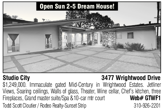 Studio City 3477 Wrightwood Drive $1,249,000. Immaculate gated Mid-Century in Wrightwood Estates. Jetliner Views, Soaring ceilings, Walls of glass, Theater, Wine cellar, Chef’s kitchen, three Fireplaces, Grand master suite/Spa &10-car mtr court Web# GTWF1 Todd Scott Cloutier / Rodeo Realty-Sunset Strip 310-926-2201
