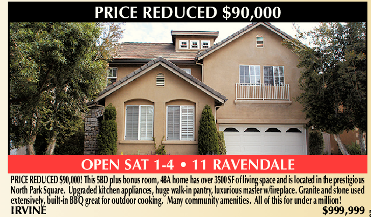 PRICE REDUCED $90,000 OPEN SAT 1-4 • 11 RAVENDALE PRICE REDUCED $90,000! This 5BD plus bonus room, 4BA home has over 3500 SF of living space and is located in the prestigious North Park Square. Upgraded kitchen appliances, huge walk-in pantry, luxurious master w/fireplace. Granite and stone used extensively, built-in BBQ great for outdoor cooking. Many community amenities. All of this for under a million! IRVINE $999,999