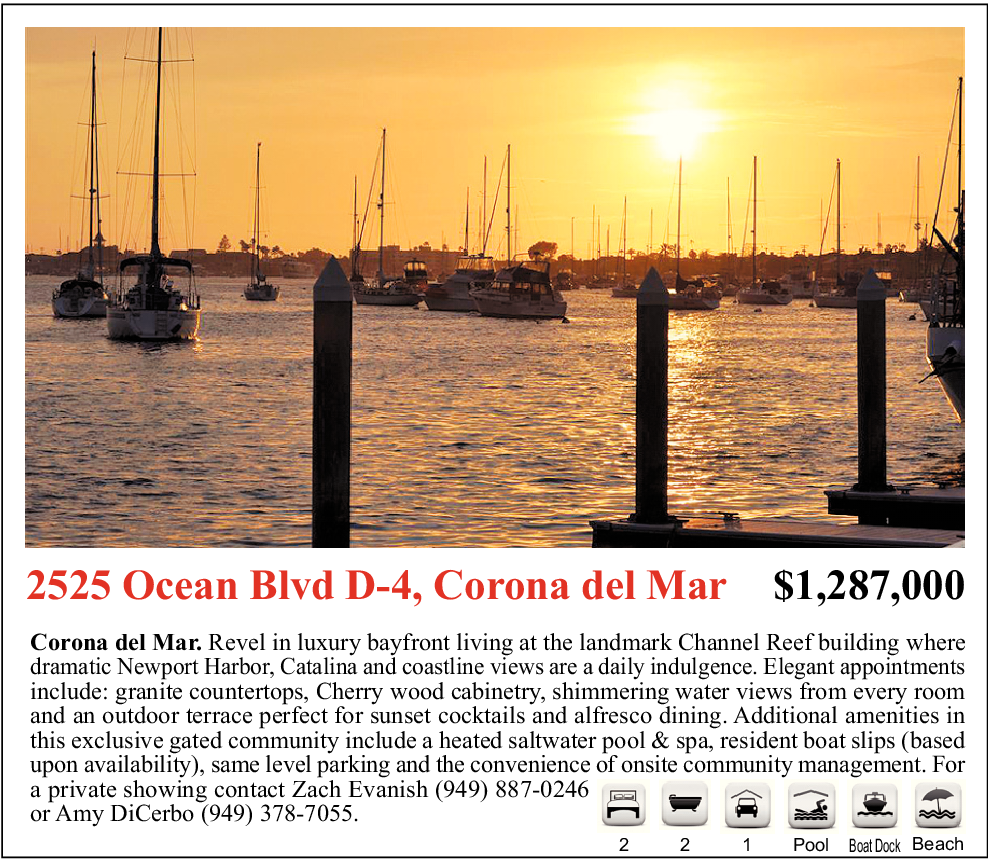 2525 Ocean Blvd D-4, Corona del Mar $1,287,000 Corona del Mar. Revel in luxury bayfront living at the landmark Channel Reef building where dramatic Newport Harbor, Catalina and coastline views are a daily indulgence. Elegant appointments include: granite countertops, Cherry wood cabinetry, shimmering water views from every room and an outdoor terrace perfect for sunset cocktails and alfresco dining. Additional amenities in this exclusive gated community include a heated saltwater pool & spa, resident boat slips (based upon availability), same level parking and the convenience of onsite community management. For a private showing contact Zach Evanish (949) 887-0246 or Amy DiCerbo (949) 378-7055. 2 2 1 Pool Boat Dock Beach