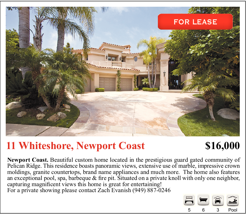 FOR LEASE 11 Whiteshore, Newport Coast $16,000 Newport Coast. Beautiful custom home located in the prestigious guard gated community of Pelican Ridge. This residence boasts panoramic views, extensive use of marble, impressive crown moldings, granite countertops, brand name appliances and much more. The home also features an exceptional pool, spa, barbeque & fire pit. Situated on a private knoll with only one neighbor, capturing magnificent views this home is great for entertaining! For a private showing please contact Zach Evanish (949) 887-0246 5 6 3 Pool See also