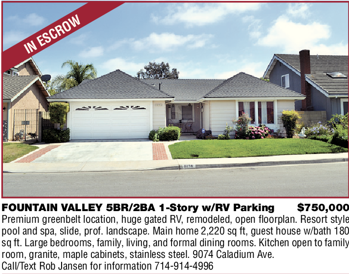 FOUNTAIN VALLEY 5BR/2BA 1-Story w/RV Parking $750,000 Premium greenbelt location, huge gated RV, remodeled, open floorplan. Resort style pool and spa, slide, prof. landscape. Main home 2,220 sq ft, guest house w/bath 180 sq ft. Large bedrooms, family, living, and formal dining rooms. Kitchen open to family room, granite, maple cabinets, stainless steel. 9074 Caladium Ave. Call/Text Rob Jansen for information 714-914-4996