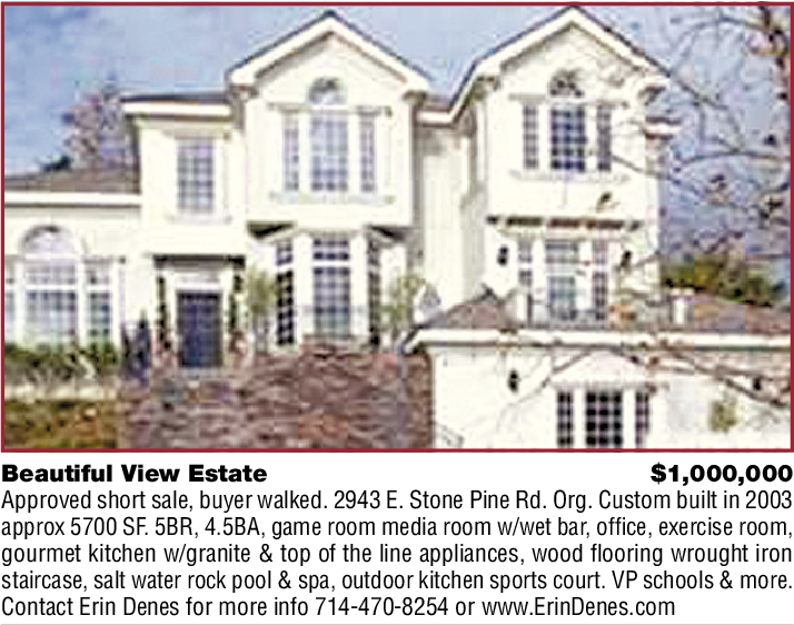 Beautiful View Estate $1,000,000 Approved short sale, buyer walked. 2943 E. Stone Pine Rd. Org. Custom built in 2003 approx 5700 SF. 5BR, 4.5BA, game room media room w/wet bar, office, exercise room, gourmet kitchen w/granite & top of the line appliances, wood flooring wrought iron staircase, salt water rock pool & spa, outdoor kitchen sports court. VP schools & more. Contact Erin Denes for more info 714-470-8254 or www.ErinDenes.com